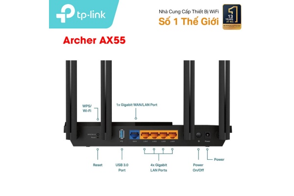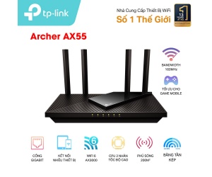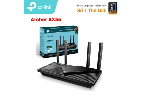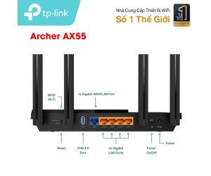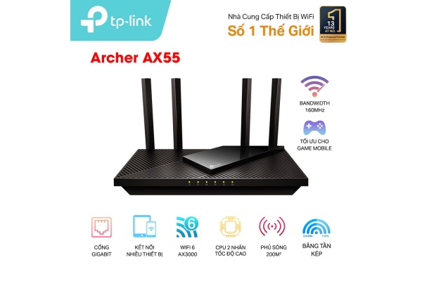 AX3000 Router Wi-FiTP-LINK Archer AX55 cho tốc độ Wi-Fi 6 Gigabit thế hệ mới — 2402 Mb/giây trên băng tần 5 GHz và 574 Mb/giây trên băng tần 2.4 GHz giúp phát trực tuyến mượt mà hơn và tải xuống nhanh hơn. Công nghệ WiFi thế hệ mới nhất mang đến tốc độ nhanh hơn, ít lag hơn và dung lượng cao hơn. Điều này cho phép bạn kết nối đồng thời nhiều hơn trên mạng gia đình.